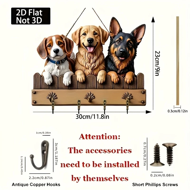 The thickness of the wooden board is 0.5 centimeters. Holes are drilled and hemp rope is attached. It comes with 4 hooks, and the hooks are shipped with the board. Installation is required by yourself. The hooks are in a bronze color. The product is 2D flat color-printed, without any engraving or hollowing techniques.