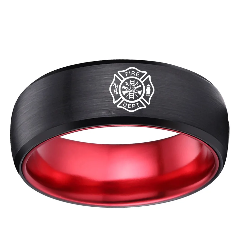 Custom Engraved Firefighter Fireman Jewelry 8mm Tungsten Wedding Band Male Cool Ring Comfort Fit Black with Red & Green Color